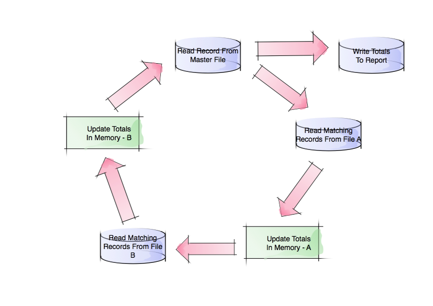 - When the Master file has been completely processed a report is written – using the summarisation information in memory.