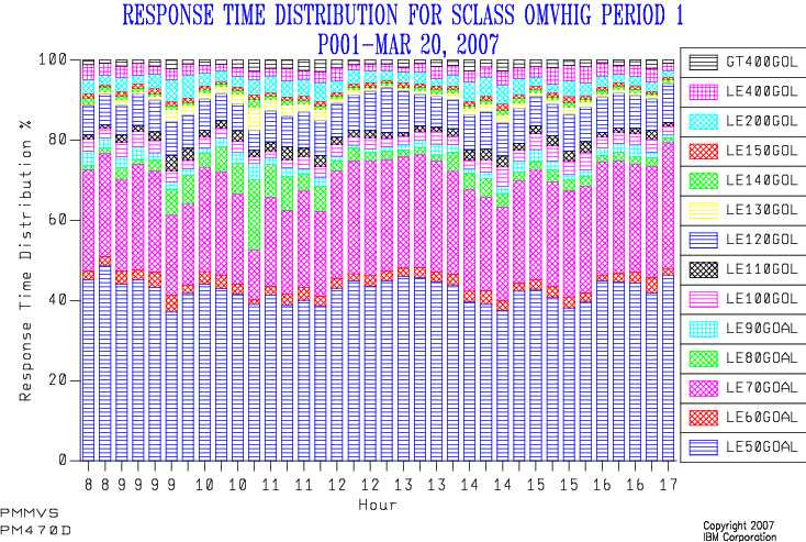 If you’re running a workload with WLM Percentile Response Time goals take a look at the RMF Service Class Period Response Time Goal Attainment instrumentation. It’s in the Workload Activity Report but this post is about using the raw data to tell the story better than a single snapshot (or long-term “munging”) can.
