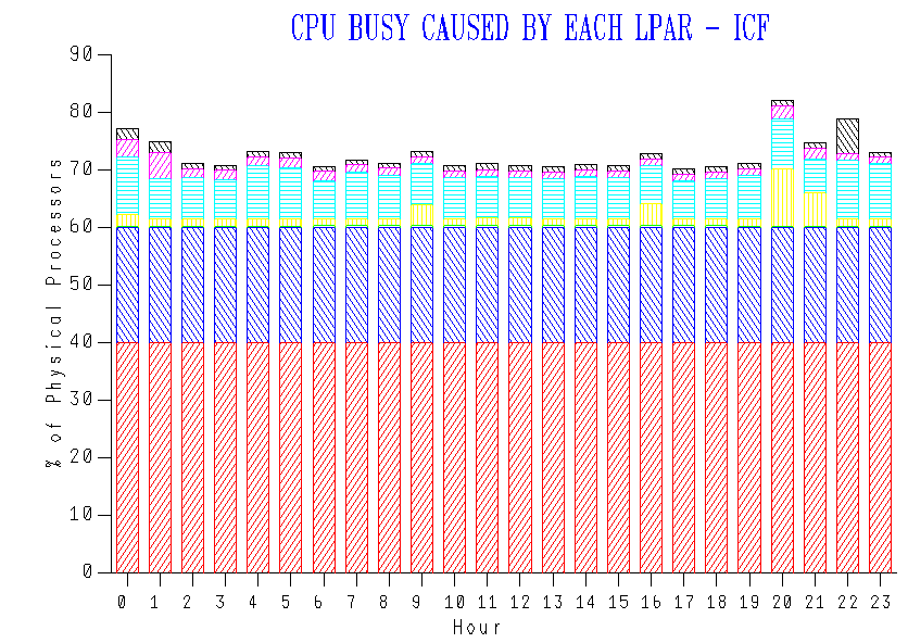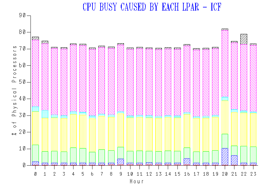 Up until now our code has stacked up ICF LPAR CPU usage by time of day like so: