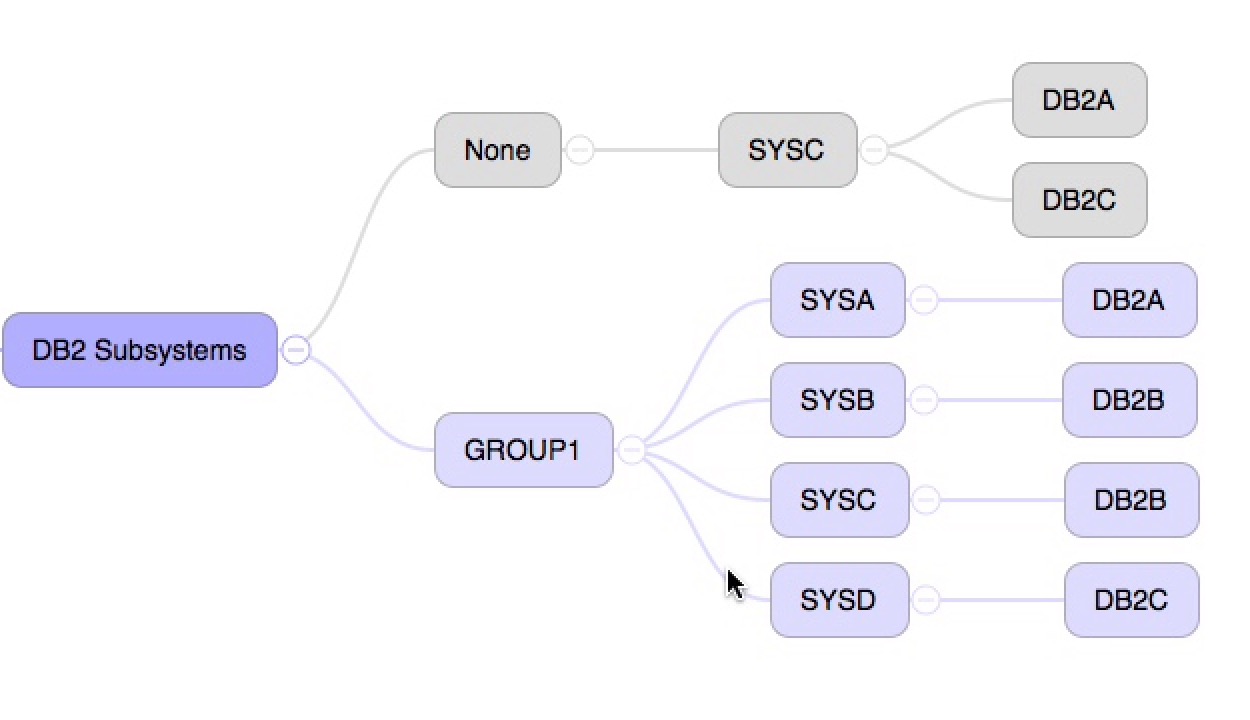 The grey colour was actually specified in the CSV file my code creates. It’s to draw attention to the fact the subsystems in that colour aren’t in a DB2 Data Sharing group. One day I could colour code the Data Sharing groups.