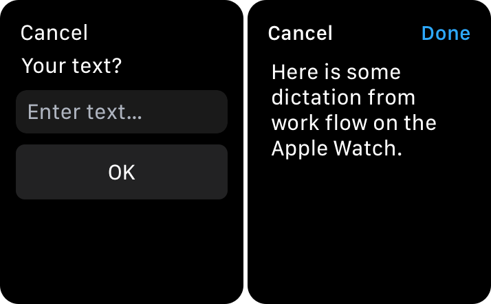 I can rapidly kick off a workflow from the dock in the Watch. The left side below shows the first screen. You can dictate from there. The result is the screen on the right.