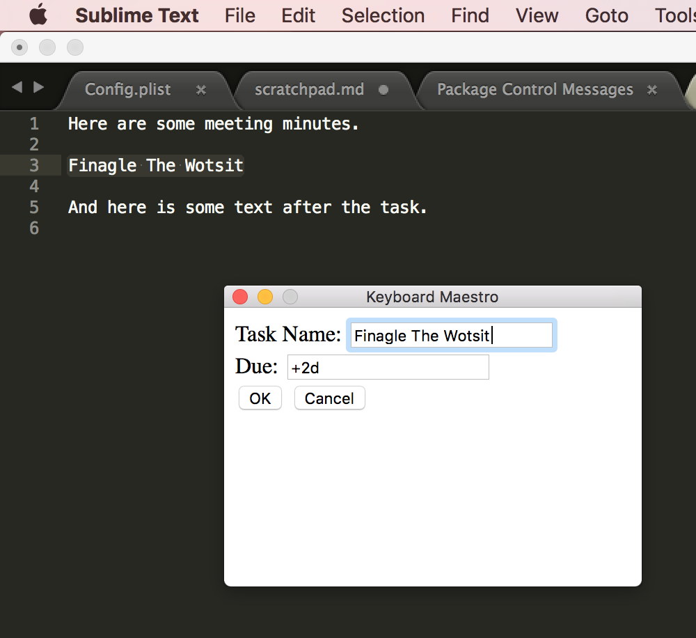 - When in a meeting take notes in Sublime Text in Markdown format, with tasks in Taskpaper format. Here selecting the text of the task and typing Ctrl+t1 pops up a dialog that lets me type in a due date. The selected text is replaced by the Taskpaper text.