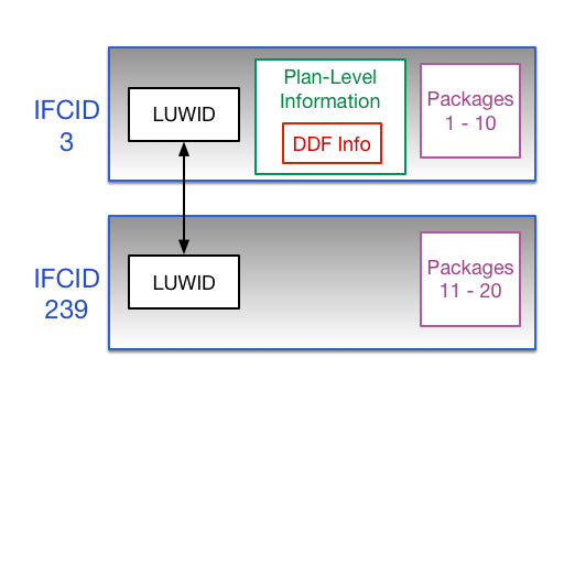 Prior to DB2 Version 8 package-level information was recorded in the main (IFCID 3) 101 record. IFCID 239 (also 101) records contained overflow package sections only, as shown in the following diagram. My code picked up the first few packages in the IFCID 3 record.