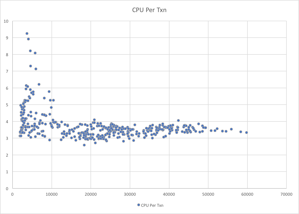 In this case it’s the lower transaction rates that are associated with the higher CPU per transaction. But not all low transaction rate data points show high CPU per transaction.