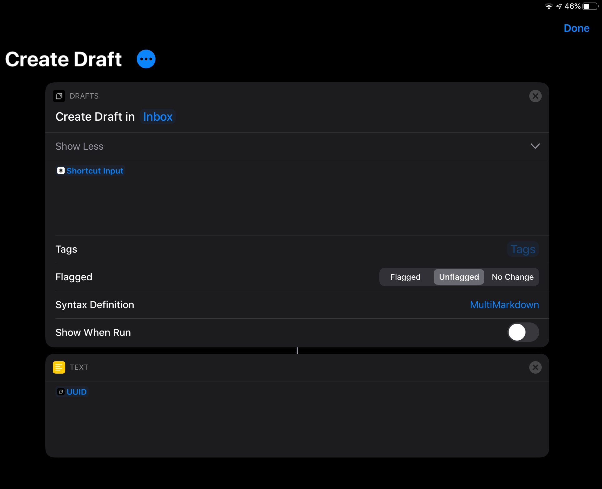 The first action is the interesting one. It takes the shortcut’s input as the text of the draft and creates the draft. Deselecting “Show When Run” is important as otherwise the Drafts user interface will show up and you don’t want that with an Automation Server. (It’s likely to temporarily stall automation.)