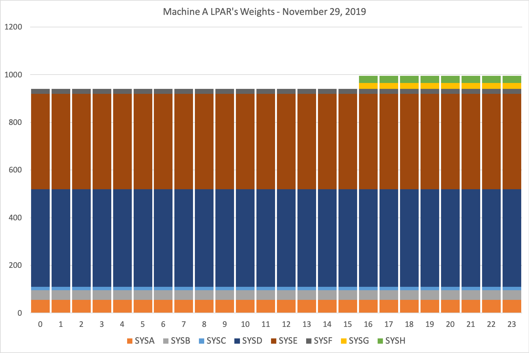 In particular, I need to augment my pool-level time-of-day graphs with a stack of the LPARs’ weights. This would help in at least two ways: