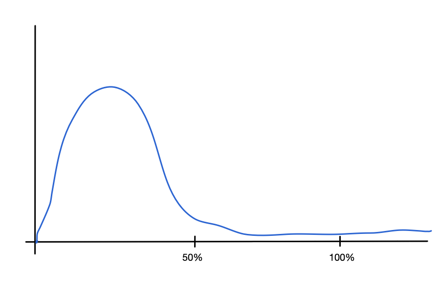 This first graph shows a transaction distribution where the transactions have response times tending towards way shorter than 50% of the goal time.