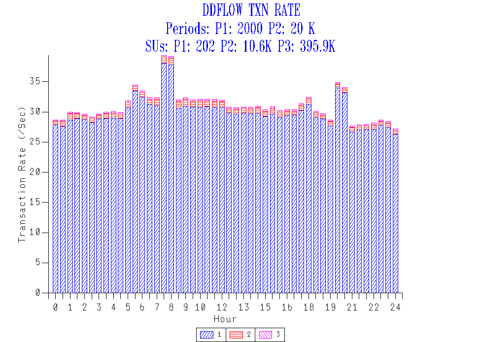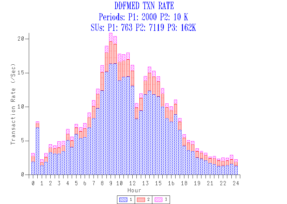 Each graph plots transaction ending rates for each period of the Service Class across a day. In the heading is information about period boundaries and how many service units the transactions ending there consumed on average. I feel the usefulness of that latter will emerge with more experience – and I might write about it then. (And graph headings is one place my code has a high tendency to evolve, based on experiences with customers.)